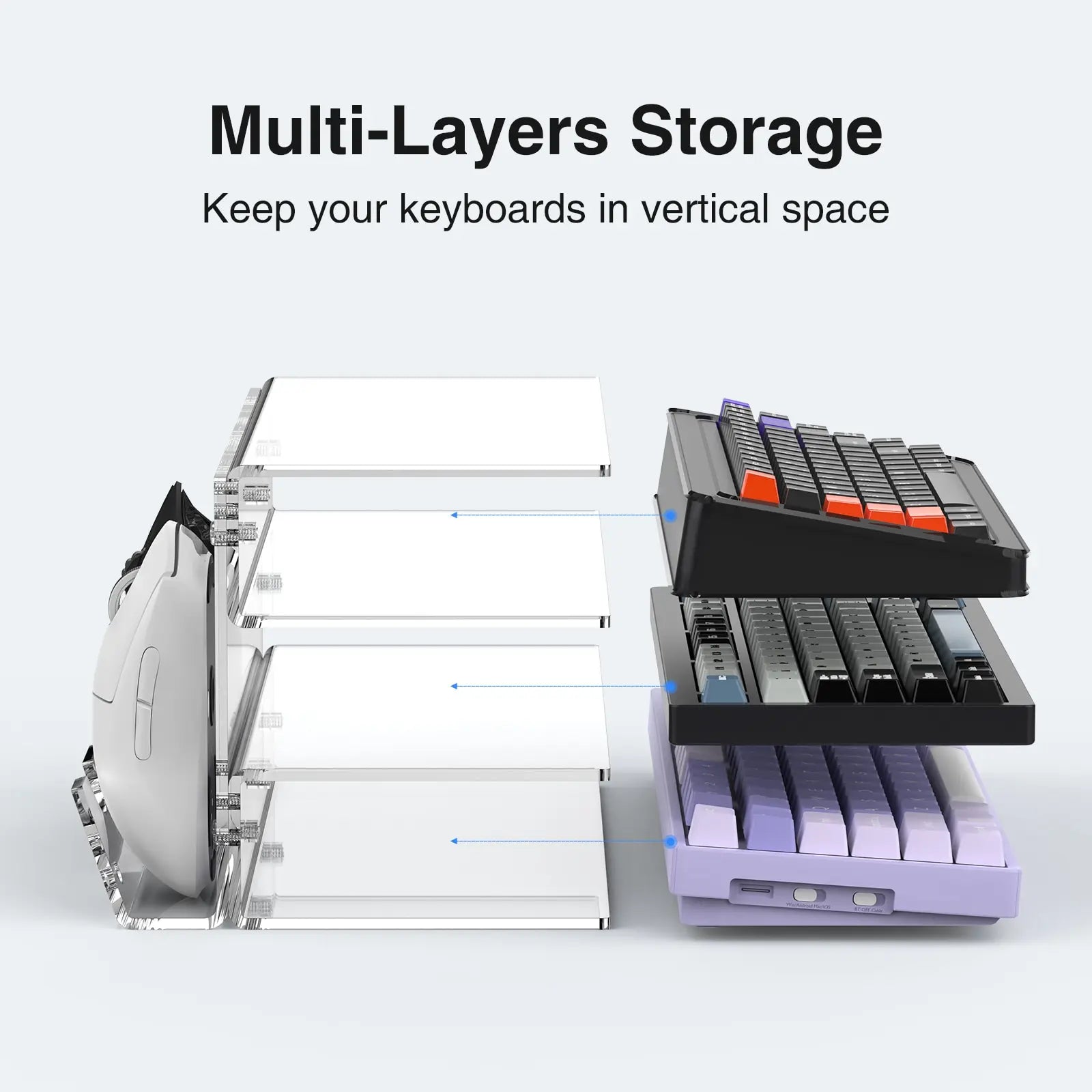 Three open shelves hold your favorite 60%, 65%, TKL, or full‑size boards, while the rear mouse rack keeps your daily drivers off the desk but within easy reach. The clear acrylic build keeps attention on your gear and fits naturally into gaming setups, studios, and workspaces.
